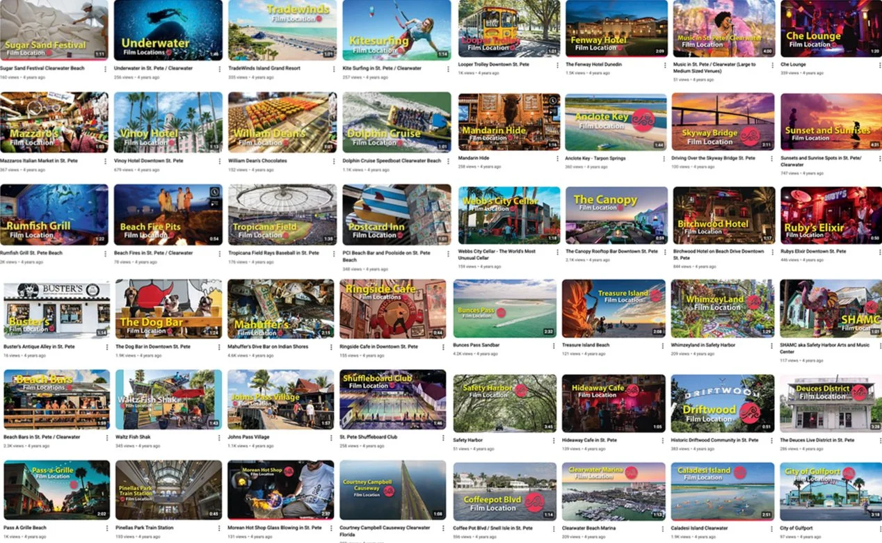 Image Description: Thumbnail grid showcasing 50+ finalized videos from the Film Locations in St. Pete/Clearwater series